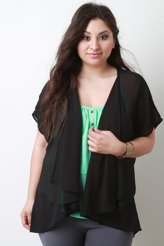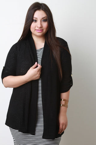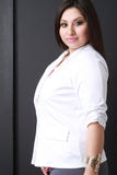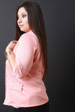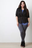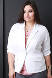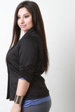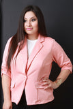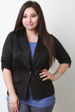 This classic plus size blazer features smooth stretch knit, classic lapels, single button closure, faux pocket flaps, and ruched sleeves. Accessories sold separately. 96% Polyester, 4% Spandex.