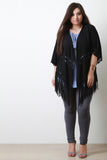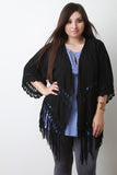 This plus size kimono features a woven knit fabrication, 3/4 sleeves construction, macrame knit accents and finished with fringed hemline. Accessories sold separately. 40% Acrylic, 40% Cotton, 20% Polyester.