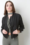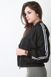 This bomber style jacket features zip-up front, rib knit trim, double striped sleeves, two snap button pockets, and finished with lining. Accessories sold separately. 100% Polyester.