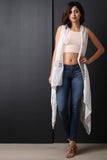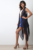 This sleeveless cardigan features a woven knit fabrication with contrasting crochet trim and panels, open-front, and finished with a long asymmetrical hemline. Accessories sold separately. 100% Acrylic.
