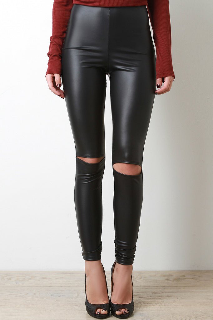 These legging pants features a vegan leather fabrication, high rise elasticized waist, stretchy sculpture fit, taper cut legs, and slit keyhole at knees. Accessories sold separately. Made in U.S.A. 95% Polyester, 5% Spandex.