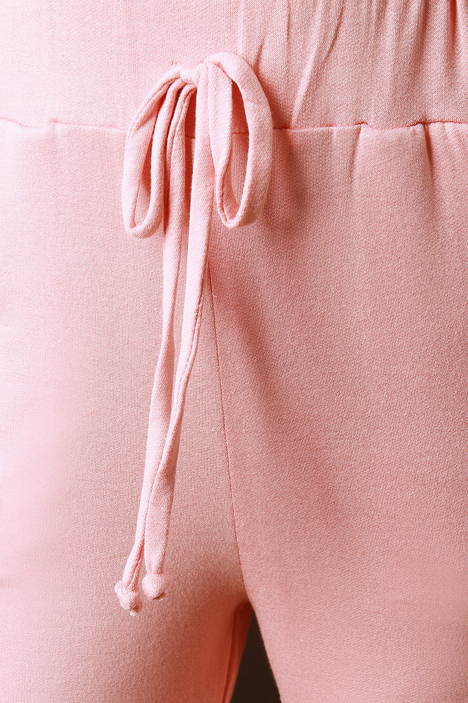 These soft terry cloth jogger style pants features a high waisted, wide elasticized waist, draw string d�cor, side pockets, knee cutout, and elasticized band hemline. Made in U.S.A. Accessories sold separately. 95% Rayon, 5% Spandex.