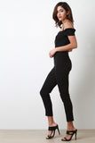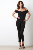 This jumpsuit features a structure bardot neckline, removable/adjustable shoulder straps, vertical boning, cinched waist seam, hidden zipper fastener at back, and taper cut legs. Accessories sold separately. 97% Polyester, 3% Spandex.