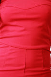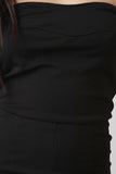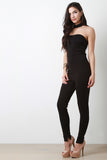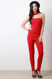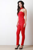 This jumpsuit features a tube neckline, choker neck, zipper racer back, high waisted cinched seam, and taper cut legs. Accessories sold separately. Made in U.S.A. 63% Rayon, 32% Polyester, 5% Spandex.