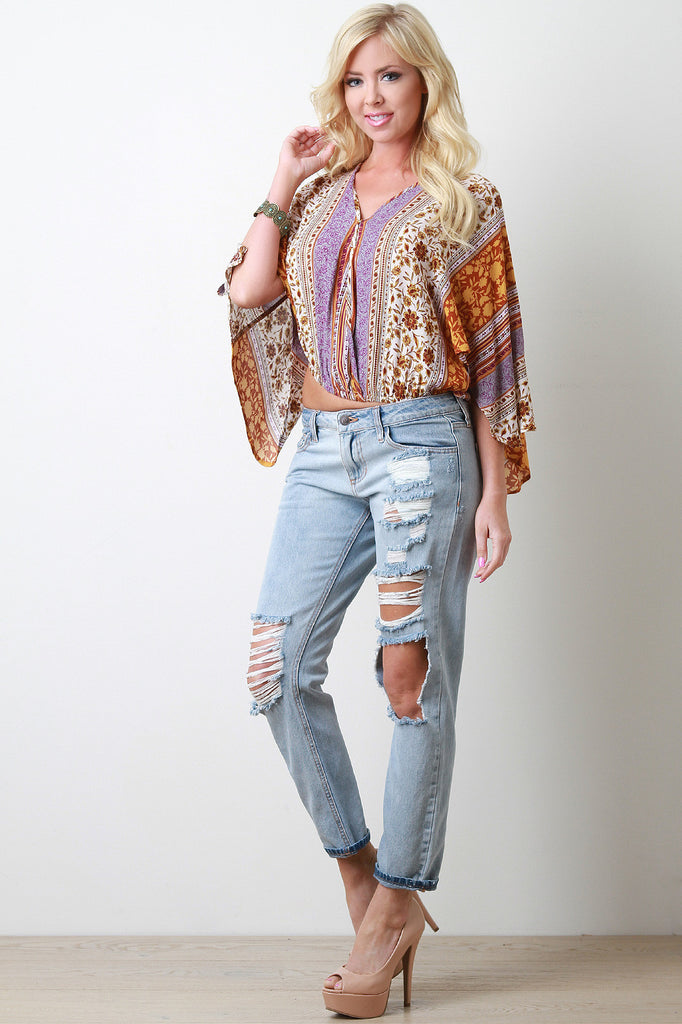 These boyfriend jeans feature a large cutouts, vintage fading, and shredded holes. Finished with a belt loops, classic 5-pocket design, low rise construction, cropped legs, slightly slouchy boyfriend-style silhouette, and zipper fly with a single button closure. Accessories sold separately. 100% Cotton.