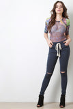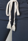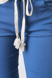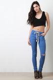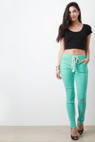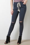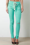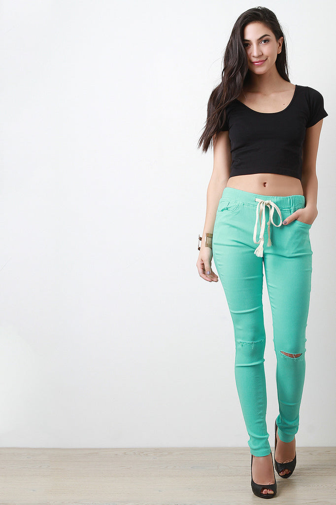 This pair of skinny pants feature soft stretchy knit fabrication, elasticized waistline with drawstring, classic 5 pockets, and knee slits. Accessories sold separately. 95% Cotton, 5% Spandex.