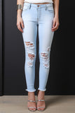 This pair of jeans feature a light stone wash, distressed patches detail at front, low rise silhouette, four pockets, belt loops and zipper fly with single button closure. Finished with a frayed hem. Accessories sold separately. Made in U.S.A. 73% Cotton, 14% Rayon, 11% Polyester, 2% Spandex.