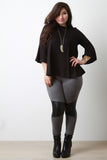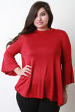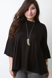 A plus size top featuring a mock neckline with a keyhole back and two glossy round buttons at the nape, three-quarters bell sleeves, and a relaxed fit bodice. Accessories sold separately. Made in U.S.A. 95% Rayon, 5% Spandex.