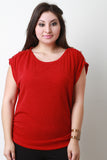 A plus size knit top featuring short dolman sleeves with button accents at the shoulders, a round neckline, and ruched sides. Accessories sold separately. Made in U.S.A. 96% Polyester, 4% Spandex.