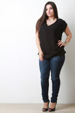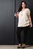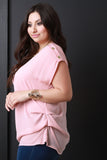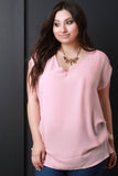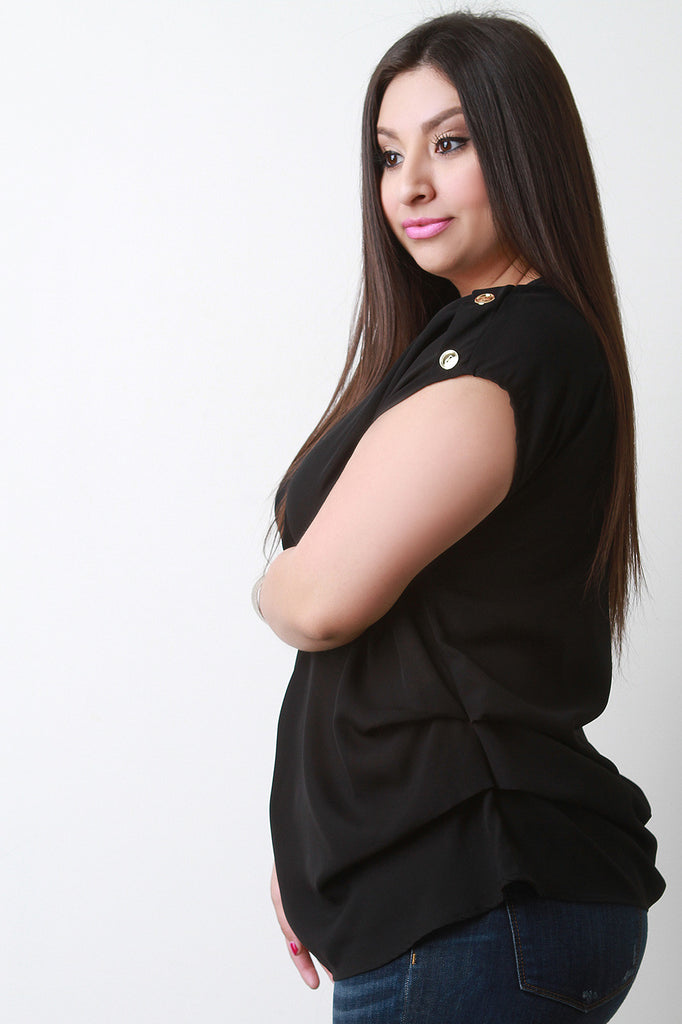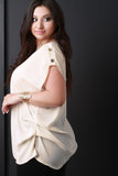 This plus size blouse features a v-neckline, short dolman sleeves with triple buttons accent, and gathered sides design. Accessories sold separately. Made in U.S.A. 100% Polyester.