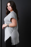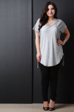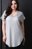 A thin striped bodice. Top also features a round hem at the front, side slits, and a squared hem at the back. Accessories sold separately. Made in U.S.A. 95% Rayon, 5% Spandex.