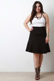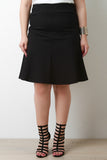 A plus size midi skirt featuring a vertical panel design, trapeze a-line shape, and concealed back zipper closure. Accessories sold separately. Made in U.S.A. 65% Rayon, 30% Nylon, 5% Spandex.