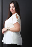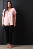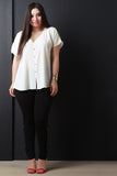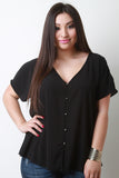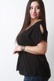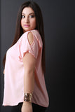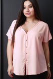 This p lus size blouse features a v neckline, short sleeves with cold-shoulder cutouts, decorative button-up detail, and curved hemline. Accessories sold separately. Made in U.S.A. 99% Polyester, 1% Spandex.