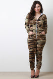 This fierce plus size jumpsuit features camouflage pattern print design, zipper front, hoodie back, long sleeves, kangaroo pockets, and jogger cut legs. Accessories sold separately. Made in U.S.A. 95% Cotton, 5% Spandex.