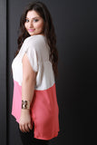 This tri-color plus size top features a round neckline, short sleeve construction, high low hemline and detachable necklace. Other accessories sold separately. 100% Polyester.