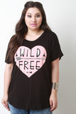 This casual plus size top features a round neckline, "WILD FREE" graphic print at front in a heart with arrow designs and rhinestones. Finished with short sleeves construction and jersey knit fabrication. Accessories sold separately. 97% Rayon, 3% Spandex.