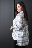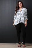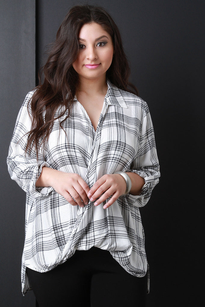 This plus size top features plaid lightweight knit, shirt collar, surplice front, long sleeves, and high-low hemline. Accessories sold separately. 100% Rayon.