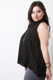 This plus size top features a mock neckline, sleeveless design, zipper back, trapeze cut fit, high low hemline, and includes long charm necklace. Accessories sold separately. Made in U.S.A. 99% Polyester, 1% Spandex.
