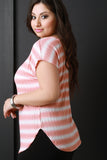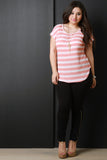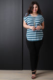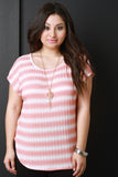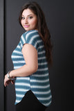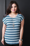 This plus size top features a tie dye ribbed knit fabrication, scoop back with decorative strap, round neckline, short cap sleeves construction, and curved hemline. Top come with a cutout pendant necklace. Other accessories sold separately. Made in U.S.A. 53% Polyester, 42.5% Rayon, 4.5% Spandex.