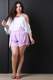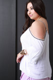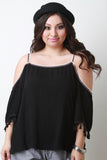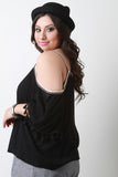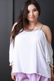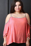 This relax fit plus size top features a cold shoulder design with chevron print thin shoulder straps, square neckline, bell sleeves with tassel trims, and straight hemline. Accessories sold separately. Made in U.S.A. 100% Rayon.