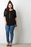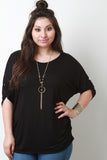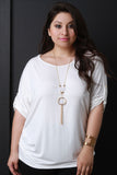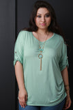 This plus size top features a round neckline, pull tab sleeves with button accent, rounded hem, and gathered accents at the sides. Includes a long necklace with acrylic shape pendants. Other accessories sold separately. Made in U.S.A. 95% Rayon, 5% Spandex.