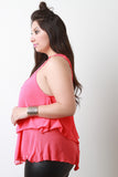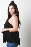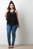 This plus size top features a v-neckline with crochet trimming, sleeveless construction, and a tiered design. Accessories sold separately. 100% Polyester.