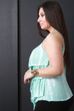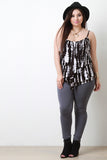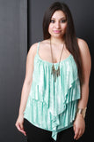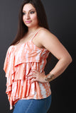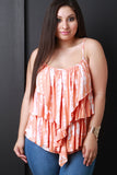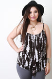 This plus size top features a tie dye jersey knit fabrication, spaghetti shoulder straps, tiered ruffles design at front, sleeveless construction, and asymmetrical hemline. Accessories sold separately. 97% Rayon, 3% Spandex.