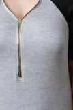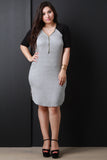 This plus size casual dress features an adjustable zippered v neckline, baseball style raglan sleeves in a contrast color, soft knit fabrication, rounded hem line that goes higher on the sides. Accessories sold separately. 97% Viscose 3% Spandex.