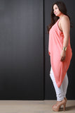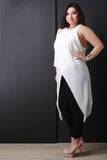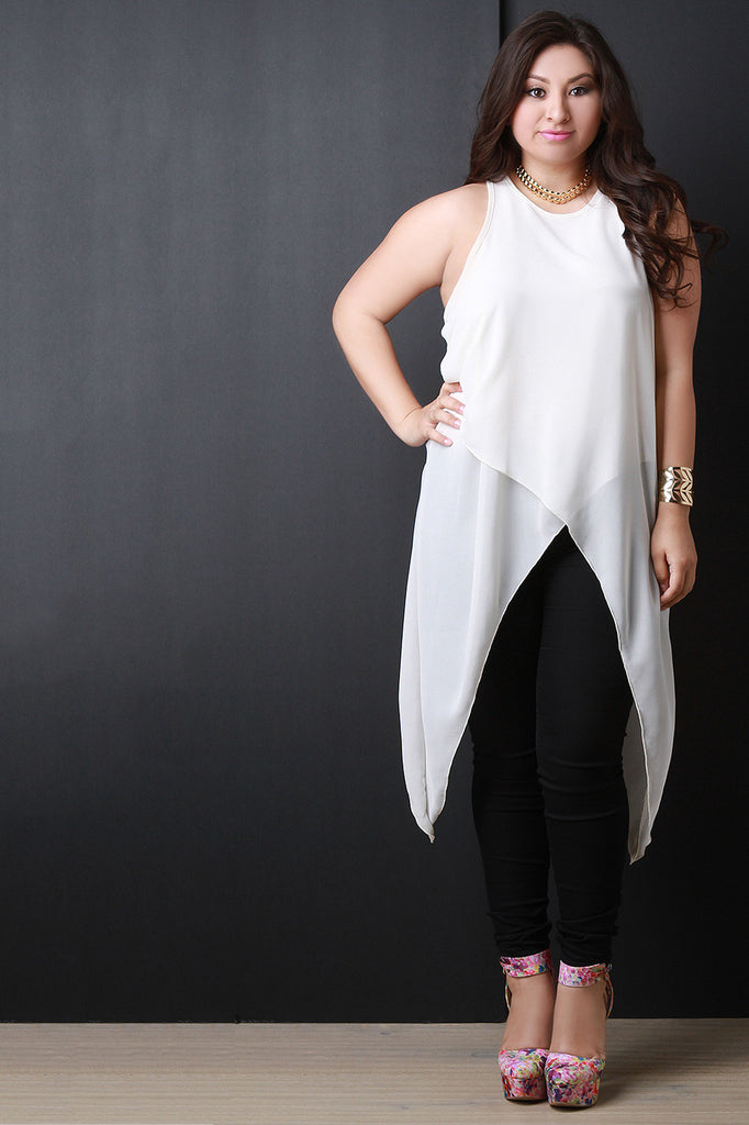 This plus size top features a semi-sheer chiffon fabrication, round neckline, sleeveless construction, and asymmetrical maxi length hemline. Finished with a single button hook at nape. Accessories sold separately. Made in U.S.A. 100% Polyester.