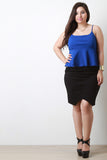 This top features a textured knit fabrication, boat neckline, spaghetti straps, peplum design, and lace-up strap open back. Finished with a cropped hemline. Accessories sold separately. Made in U.S.A. 96% Polyester, 4% Spandex.