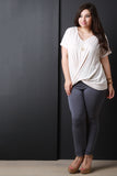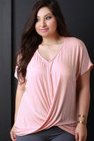 This plus size top feature a textured soft knit, twisted front design with a v-neckline, short dolman sleeves, and an asymmetrical cuffed hemline. Accessories sold separately. Made in U.S.A. 96% Rayon, 4% Spandex.
