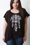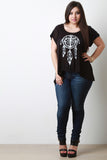 This plus size top features a jersey knit fabrication with an anchor and dreamcatcher graphic print, short sleeve construction, and high low hemline. Accessories sold separately. Made in U.S.A. 95% Rayon, 5% Spandex.