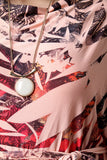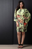 This plus size dress features a soft stretchy knit fabrication, abstract tie dye floral print design, cowl neckline, self-tie sash on waist. and long wide sleeves. Finished with a knee-length hemline. Accessories sold separately. Made in U.S.A. 95% Polyester, 5% Spandex.
