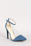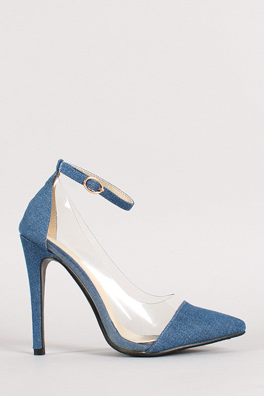 Featuring pointy toe, denim fabric upper with lucite side panels, and stiletto heel. Finished with lightly padded insole and adjustable ankle strap with buckle closure.