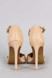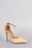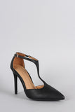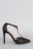 This ladylike pump features a pointy toe front, enclosed back with stiletto heel, and narrow t-strap construction with elastic gusset and adjustable buckle closure. Finished with a lightly padded insole.