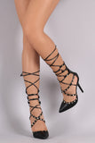 This striking pointy toe silhouette, pyramid studs detailing, strappy construction with lace up design, and wrapped stiletto heel. Finished with lightly padded insole and convenient back-zip closure.