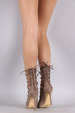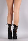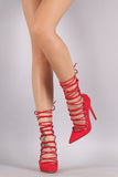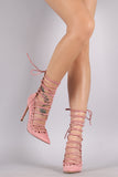 This chic pump features a pointy toe silhoutte, laser cutouts, self-tie lace up closure, and wrapped stiletto heel. Finished with a lightly padded insole, and rear zip-up closure for easy on/off.