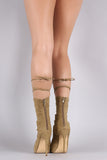 This heel features an open toe design, vegan suede straps with self-tie lace up design, open toe silhouette, and wrapped stiletto heel with a small platform. Finished with lightly padded insole and back-zip closure.