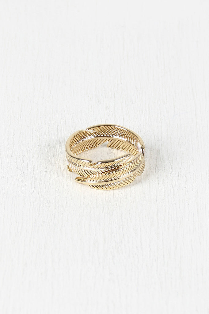 This gold-tone ring features a wrapped around leaves design and glossy finished. Non-adjustable.