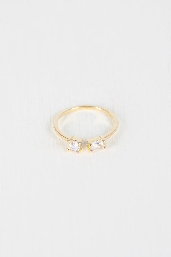 This delicate and sophisticated ring features high polish gold tone band and open ends accented with rhinestones.