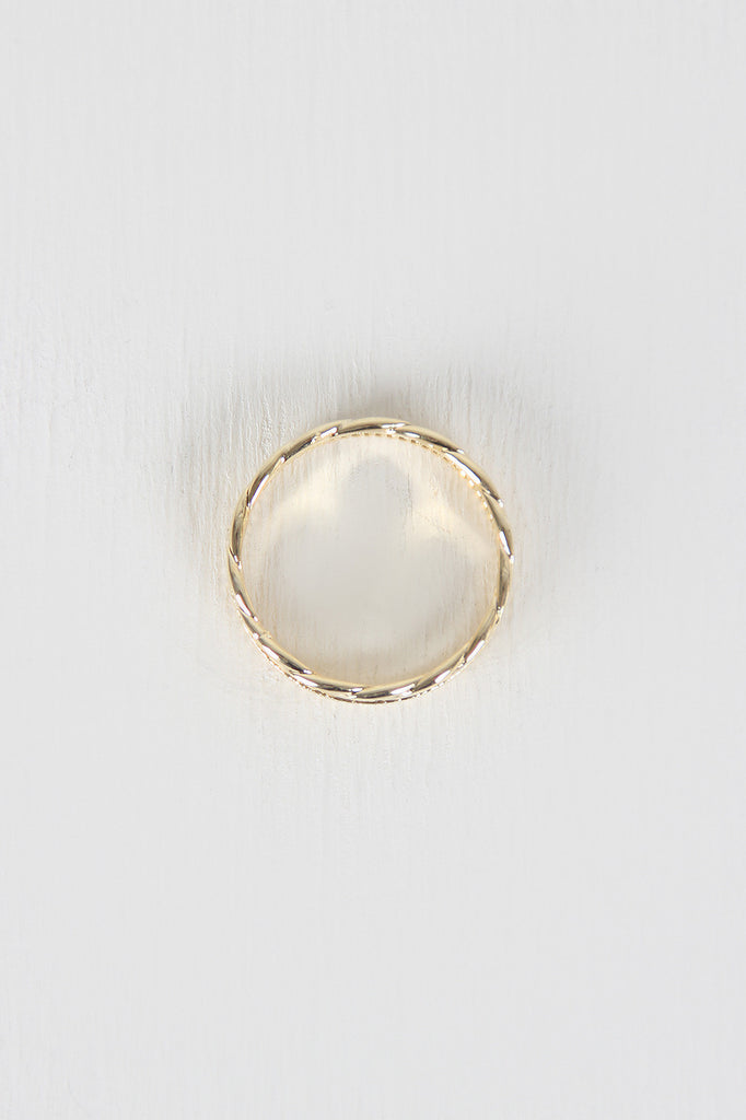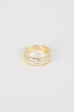 This ring features a faux stacked look, 3 different textured bands. Non adjustable.