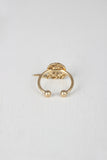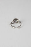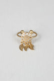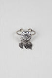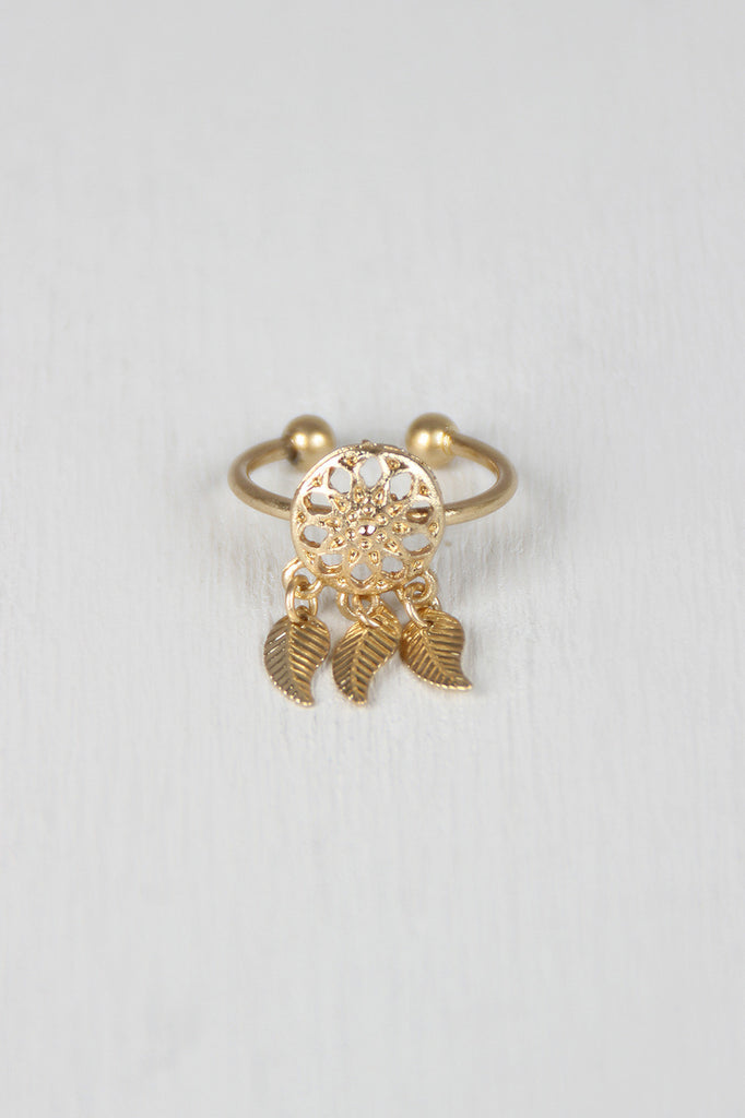 This dainty ring features a circle dream catcher design with detail cut out and three dangle leaf charm attached, open ended band. Non-Adjustable.