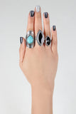 This set of three rings features one ring with faux stone center, one ring with engraving detail and black filled center and one ring with a gemstone center and rhinestone detail band. Bands are not adjustable.