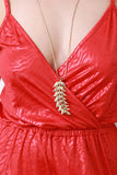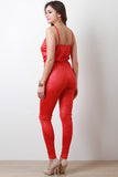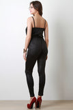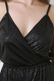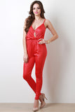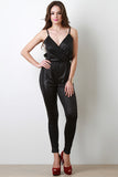 This chic jumper features a surplice v-neckline, spaghetti shoulder straps, elasticized waist, taper legs, and animal stripe pattern throughout. Accessories sold separately. Made in U.S.A. 92% Polyester, 8% Spandex.