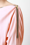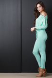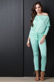 This jumpsuit features soft knit, boat neckline with zipper accent, long sleeves, and elasticized waist with self-tie drawstring. Accessories sold separately. Made in U.S.A. 95% Rayon, 5% Spandex.