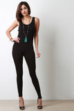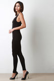 This jumpsuit features soft stretch jersey knit, scoop neckline, deep scoop back, and taper cut legs. Accessories sold separately. Made in U.S.A. 95% Rayon, 5% Spandex.