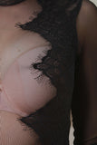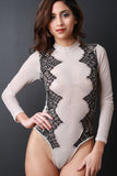 This semi-sheer bodysuit features a lace fabrication, round neckline, single button closure at nape, and long sleeves. Finished with a double snap button closure at crotch. Accessories sold separately. Made in U.S.A. 100% Polyester.