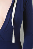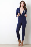 This jumpsuit features a drawstring hood with plunging neckline, long sleeves, a jersey knit fabrication, and finished with taper cut legs. Accessories sold separately. Made in U.S.A. 95% Cotton, 5% Spandex.