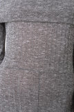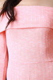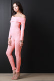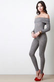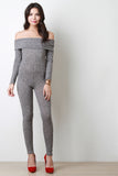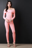 This jumpsuit features ribbed knit, off the shoulder neckline, long sleeves, and taper cut legs. Accessories sold separately. Made in U.S.A. 95% Polyester, 5% Spandex.