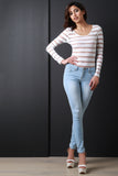 This bodysuit features a semi-sheer stripe mesh fabrication, round neckline, long sleeves and double snap button closure at crotch. Accessories sold separately. Made in U.S.A. 92% Polyester, 8% Spandex.